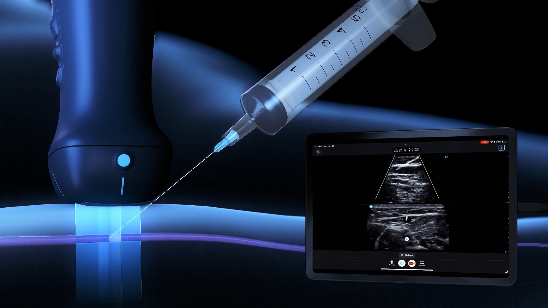 What I can also do is go to the action buttons and push biplane, and what this lets me do is look at it in two separate planes. So on the top one you see that blood vessel longitudinal. So as the needle enters, you'll see it actually enter that vessel and slide up. And then the other one in the lower screen shows the transverse. And so basically we're taking a cross section of that blood vessel.