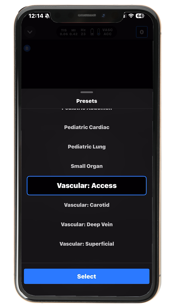 So let's talk about vascular access. This is one of the great things that you can do with ultrasound. I'm using the Butterfly IQ 3 plugged into my iPhone here. First thing I'm going to do is go to presets and make sure I'm on vascular access. I'm going to select that, and as you can see, if I place it over a vessel. Right there. I've got it over that vein, and you can see that dark circle. And then the other thing that you can do is gently press down on it, and you'll see that vein easily compresses. So now I know I'm right over a vein and I've got a transverse view of it.