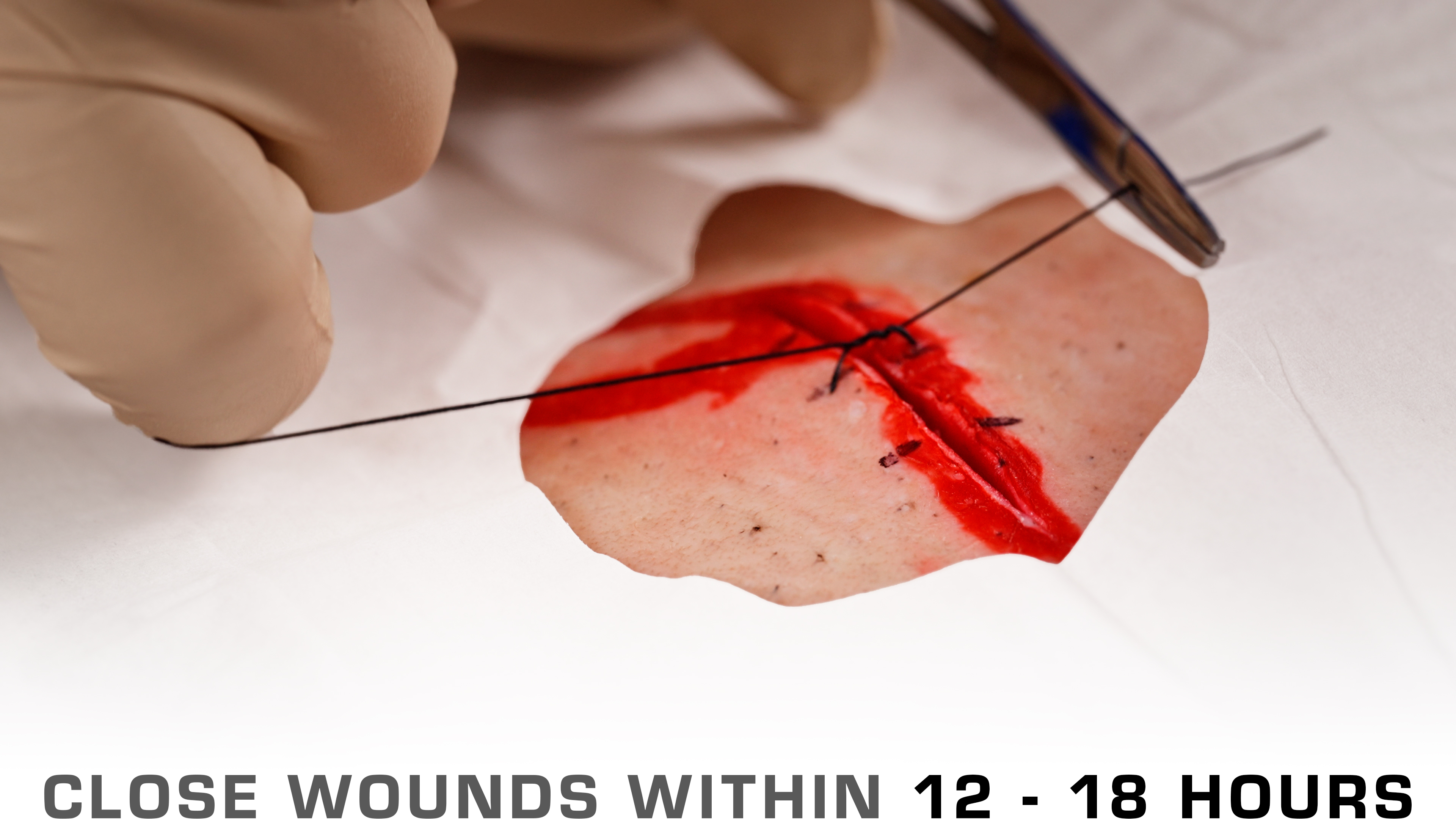 So let's talk about timeline of when to close a wound. In general, you want to close a wound if you're going to do sutures or some sort of a wound closure device, you want to apply that within 12 to 18 hours. Although wounds on the head in general can be closed in about 24 hours.