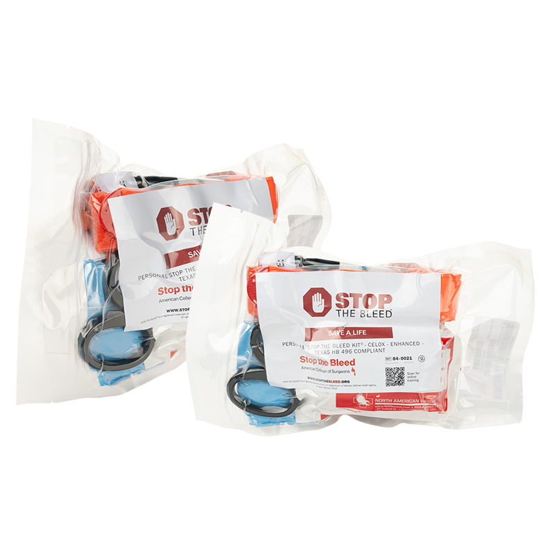 All ACS STOP THE BLEED® kits are available in four tiers - personal, premium, enhanced, and enhanced premium. These tiers meet various state laws on what should be in bleeding control kits. All kits contain tourniquets, but enhanced and enhanced premium kits add chest seals and hypothermia blankets. Each kit also has the option of either QuikClot® or Celox™ hemostatic dressing, which is designed to help blood clot faster and stop bleeding more quickly.